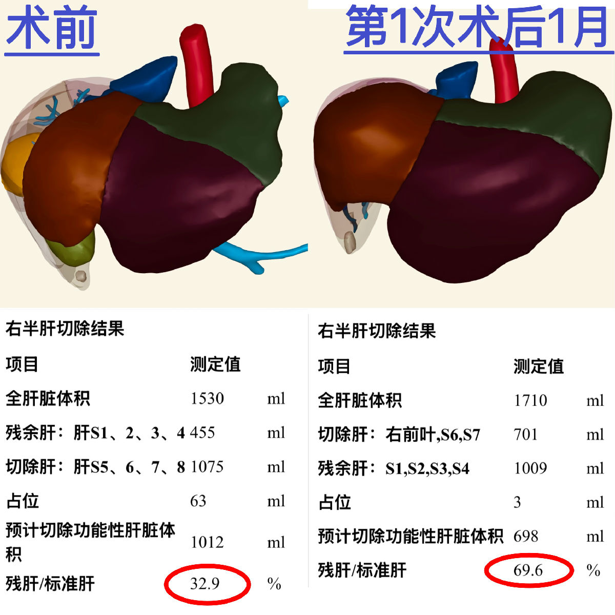 图2: “养肝”技术前后剩余肝脏再生情况,剩余肝体积从32.9%增长至69.6%,达到可切除标准。