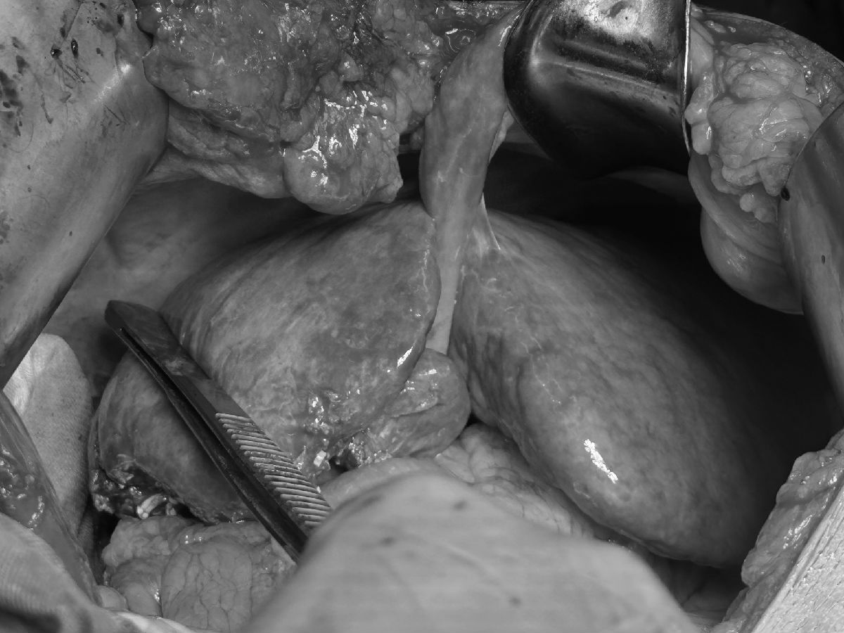 图3:根治性肝切除术后情况,剩余左半肝明显增大。