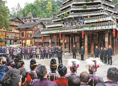 17日下午,习近平来到黔东南州黎平县肇兴侗寨考察。寨门口,身着民族盛装的村民唱起侗族大歌欢迎总书记。习近平饶有兴致地听取侗族大歌的艺术起源、曲调特点、演唱形式等方面介绍。随后,沿着村寨路道察看侗寨风貌和旅游商铺,不时驻足与店主、游客、村民互动交谈。在侗族文化展示中心,他详细了解侗族历史、风俗和服饰、建筑等特色文化保护传承情况。在侗乡特色产业基地,他观看蜡染工艺流程,对蜡染合作社坚持顾客至上、质量第一的运营理念给予肯定。习近平指出,少数民族文化是中华文化不可或缺的组成部分,既要保护有形的村落、民居、特色建筑风貌,传承无形的非物质文化遗产,又要推动其创造性转化、创新性发展,让民族特色在利用中更加鲜亮,不断焕发新的光彩。