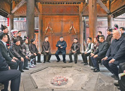 3月17日至18日,中共中央总书记、国家主席、中央军委主席习近平在贵州考察。这是17日下午,习近平在黔东南州黎平县肇兴侗寨考察时,在信团鼓楼同村干部和村民代表围坐在火塘边,共话乡村全面振兴。