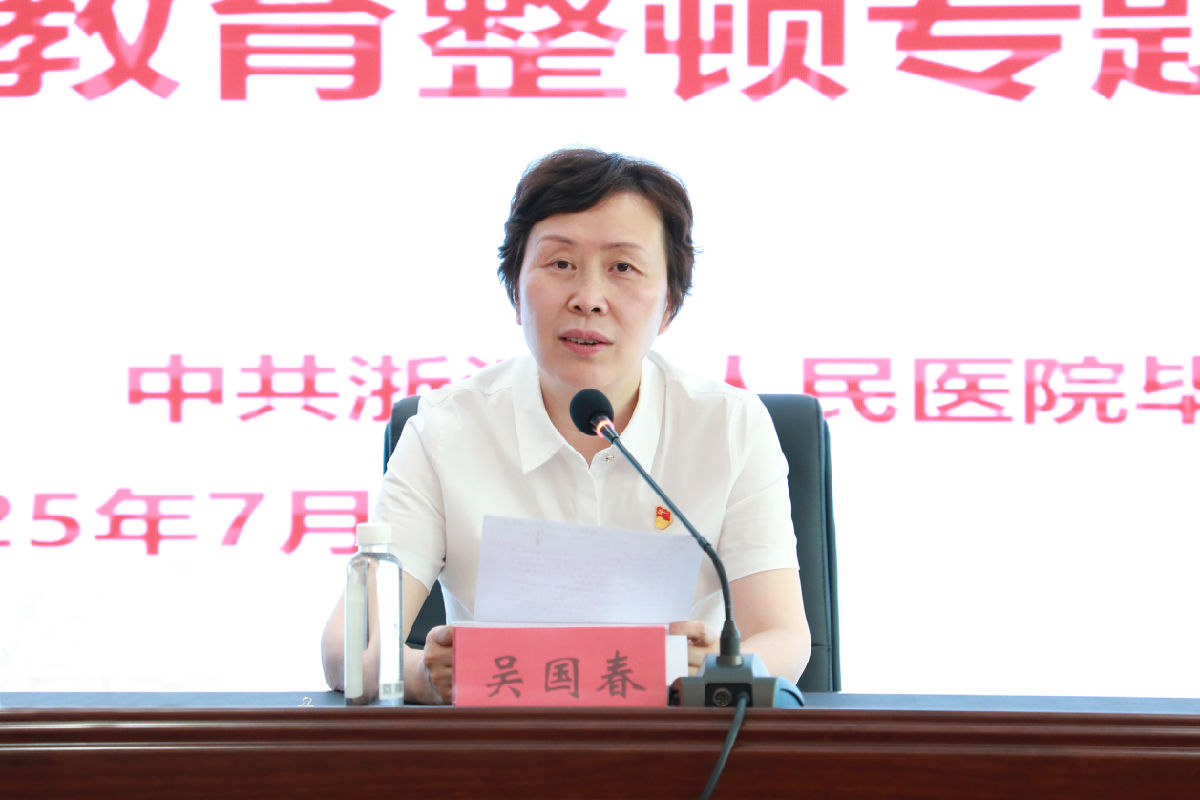 吴国春要求,浙毕医院全体党员干部要深刻认识党建引领医院高质量发展的必要性,坚持将深入贯彻中央八项规定精神学习教育、医疗卫生队伍教育整顿、群众身边不正之风和腐败问题集中整治、医德医风纠治工作同医院中心工作相结合,将廉洁行医与改善医疗服务相结合,持续优化诊疗流程、规范医疗行为,切实解决群众反映强烈的“急难愁盼”问题,用专业能力和职业操守赢得患者信任,用清正廉洁的作风护航卫生健康事业高质量发展。
